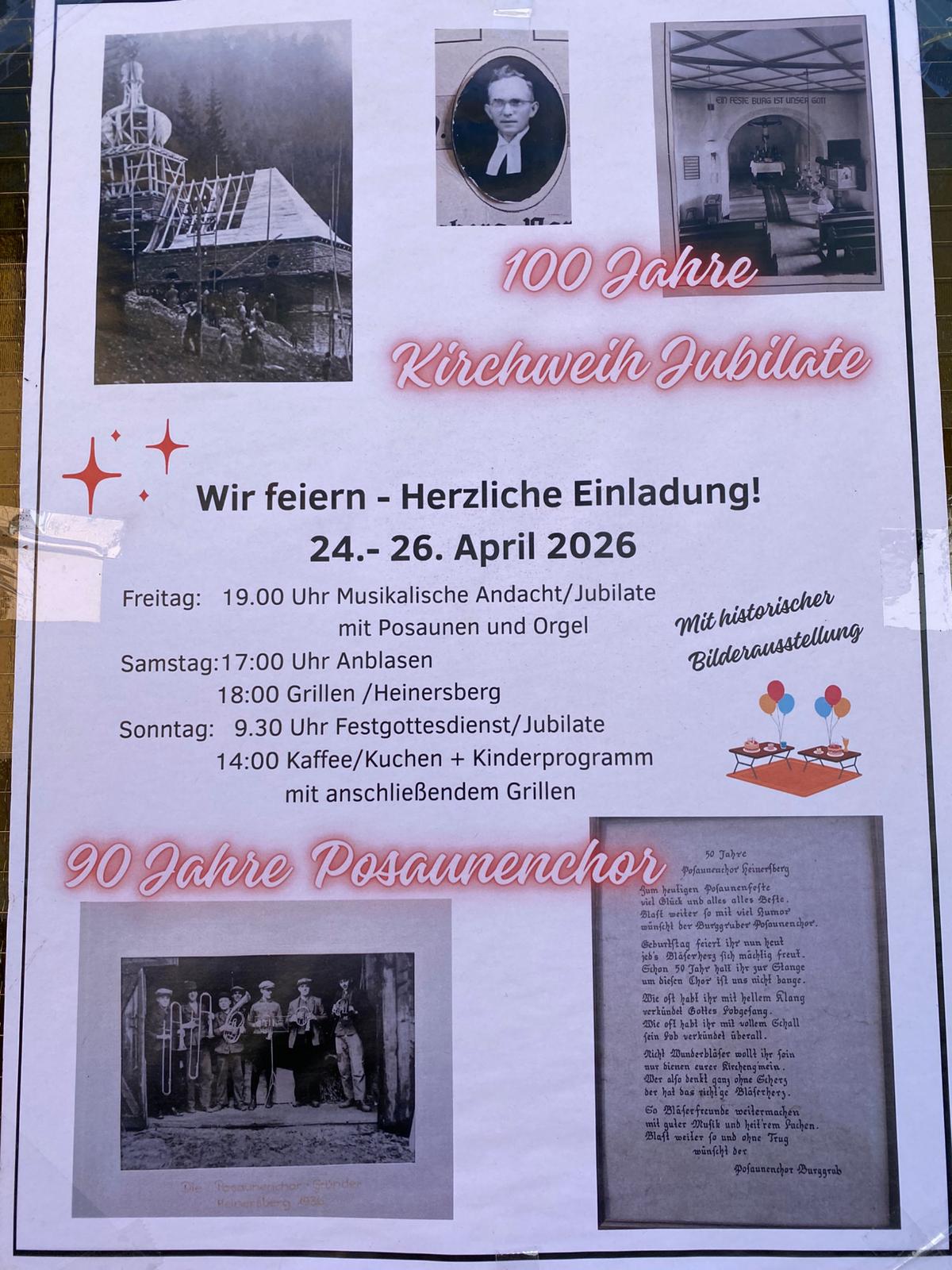Festgottesdienst mit Pfarrerin Stefani Brudereck und Prädikant Gunther Leupold. Am Nachmittag Bewirtung in der Alten Schule in Heinersberg. In der Alten Schule in Heinersberg und in der Jubilate-Kirche im Grund wird eine Zeitreise in Bildern dokumentiert und ausgestellt. |